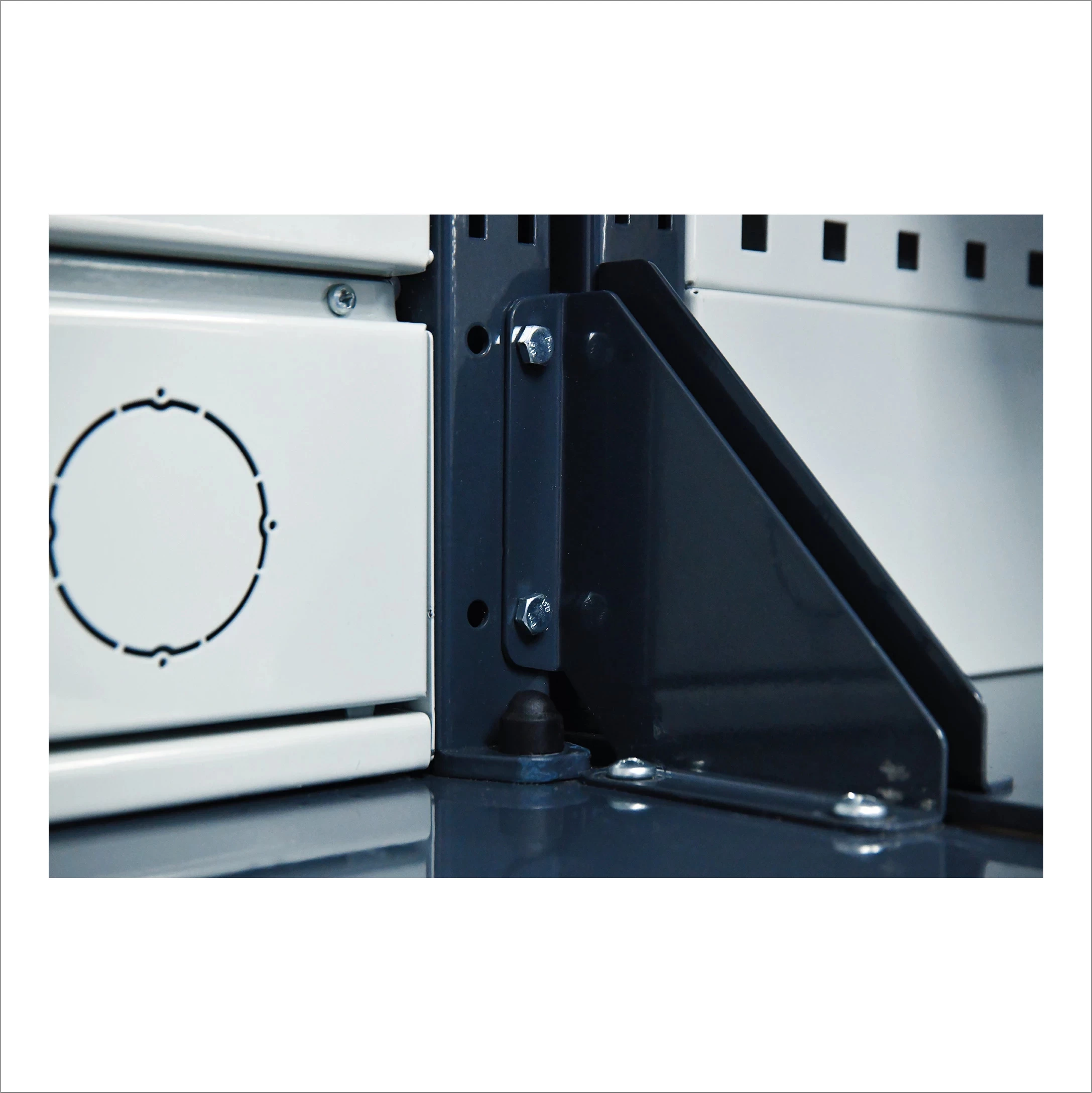 Рабочее место комплектуется двойным перфорированным экраном, на котором удобно размещать держатели для инструментов, полки и другие навесные элементы, благодаря чему весь необходимый инвентарь всегда будет на виду. Шаг перфорации — 38 мм. Максимальная нагрузка на панель — 150 кг.