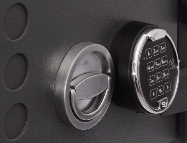 Клавиатура замка выступает на 39 мм относительно корпуса. Сейф оборудован складной поворотной ручкой в форме полукольца серебристого цвета. В сложенном виде ручка выступает относительно корпуса на 12 мм.